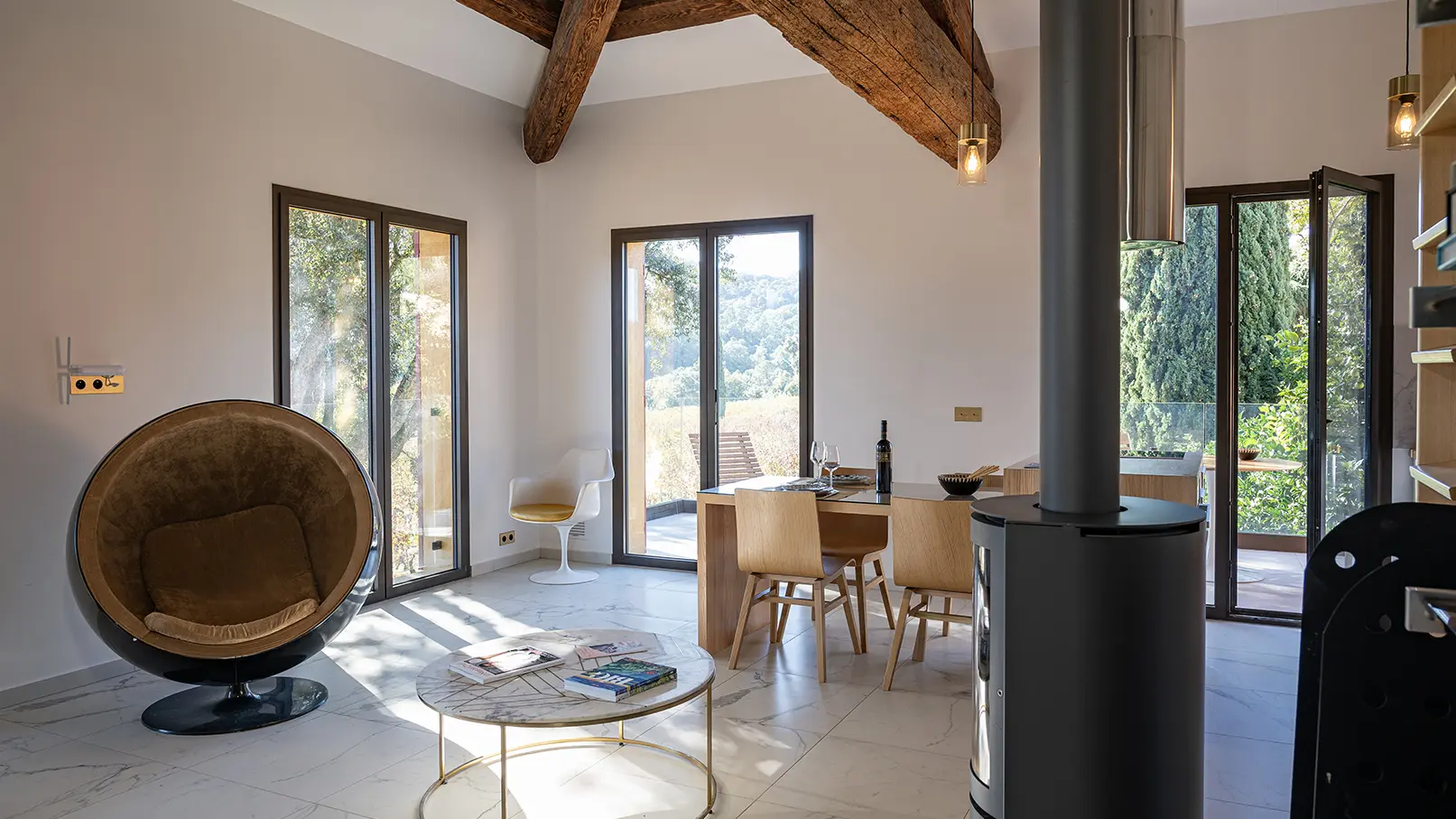 + der Wohnung: voll ausgestattete Küche, Innenwohnzimmer mit Holzofen und Außenterrasse