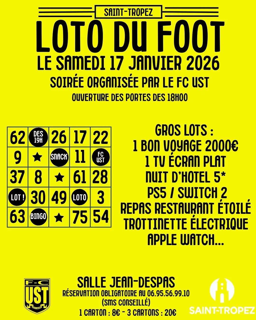 Der Abend wird vom FC UST organisiert, der Sie zum Fußball-Lotto einlädt. Die Reservierung ist obligatorisch (sms empfohlen).