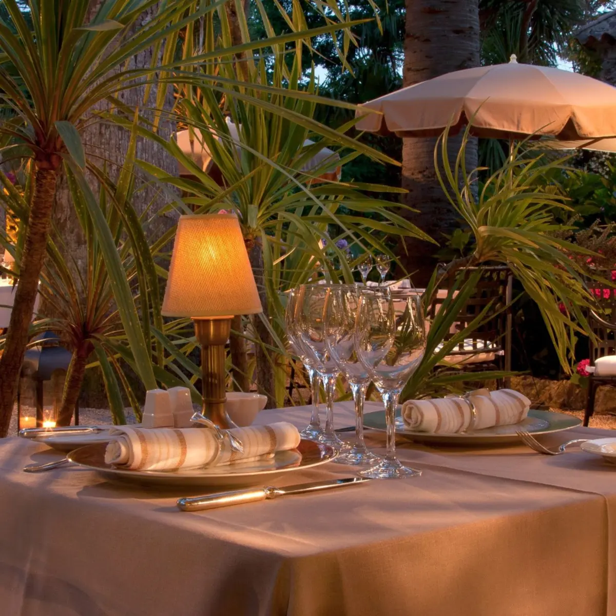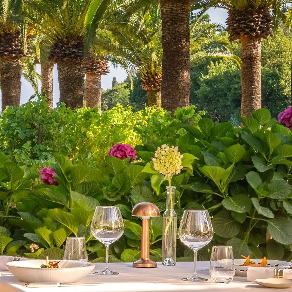 Im Herzen des hundertjährigen Palmenhains entfaltet sich die Gastronomie in einer zweiten, genussvollen Atmosphäre.