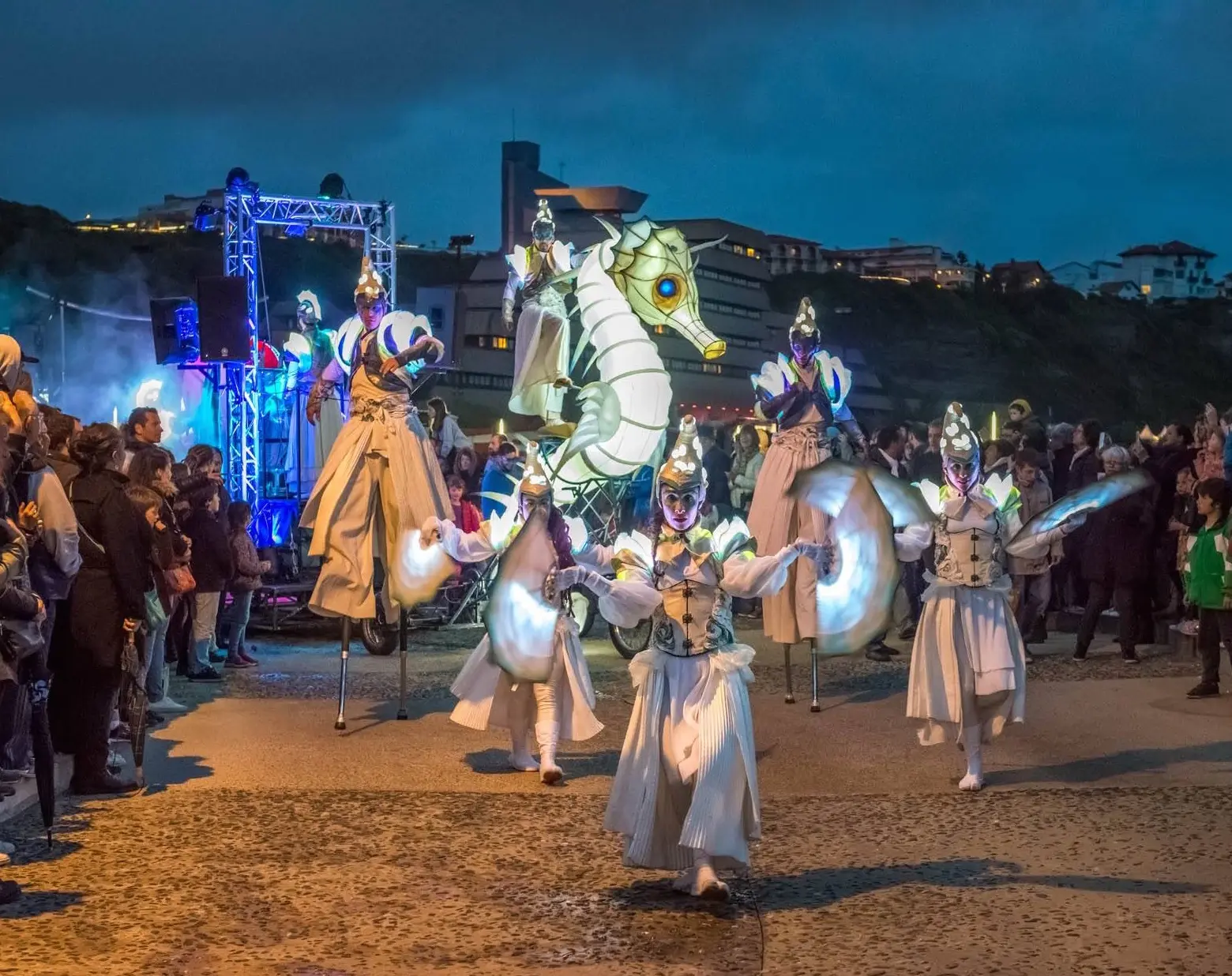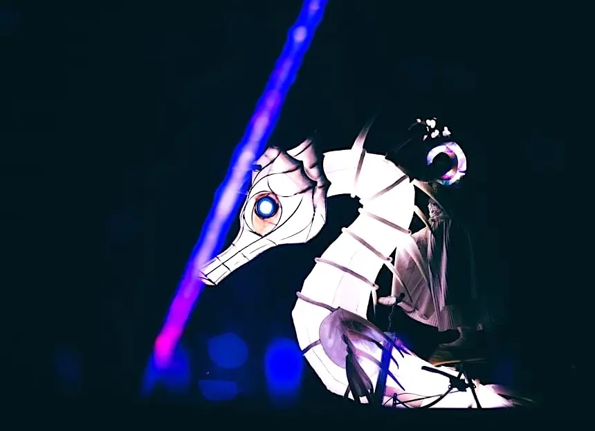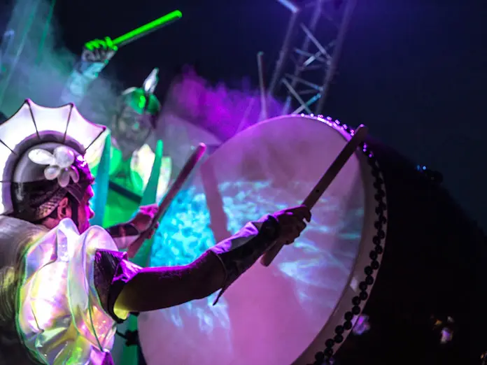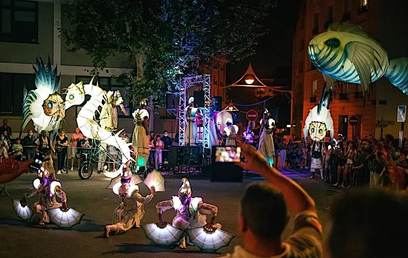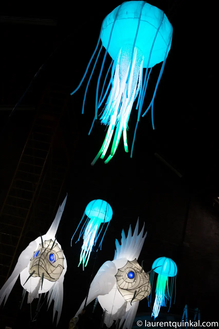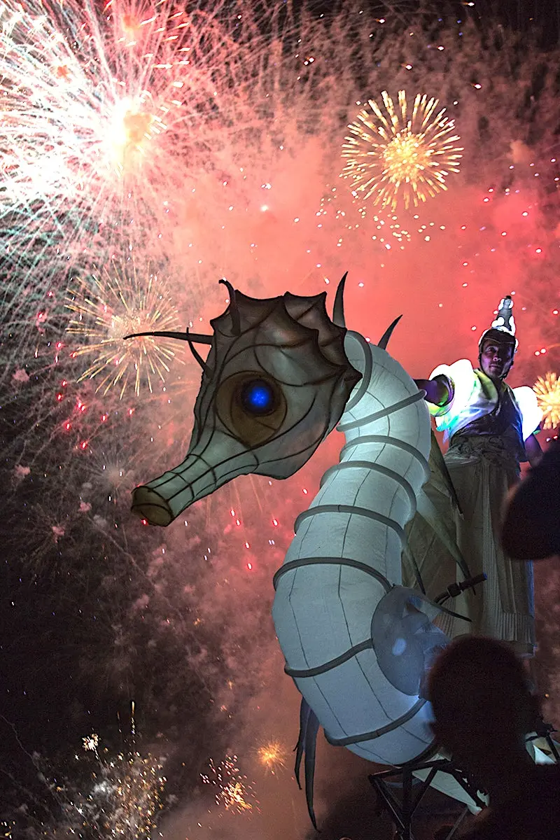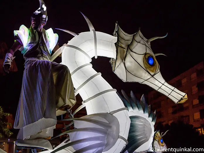 Eine beeindruckende Lichterprozession bewegt sich durch die Nacht, getragen von den Rhythmen der Taikos und Elektroklängen. Eine Milchstraße aus Quallen, funkelnde Gestirne, ein majestätisches Seepferdchen, begleitet von Stelzenläufern der Seeteufel, ziehen stolz den Wagen der Océanis an.