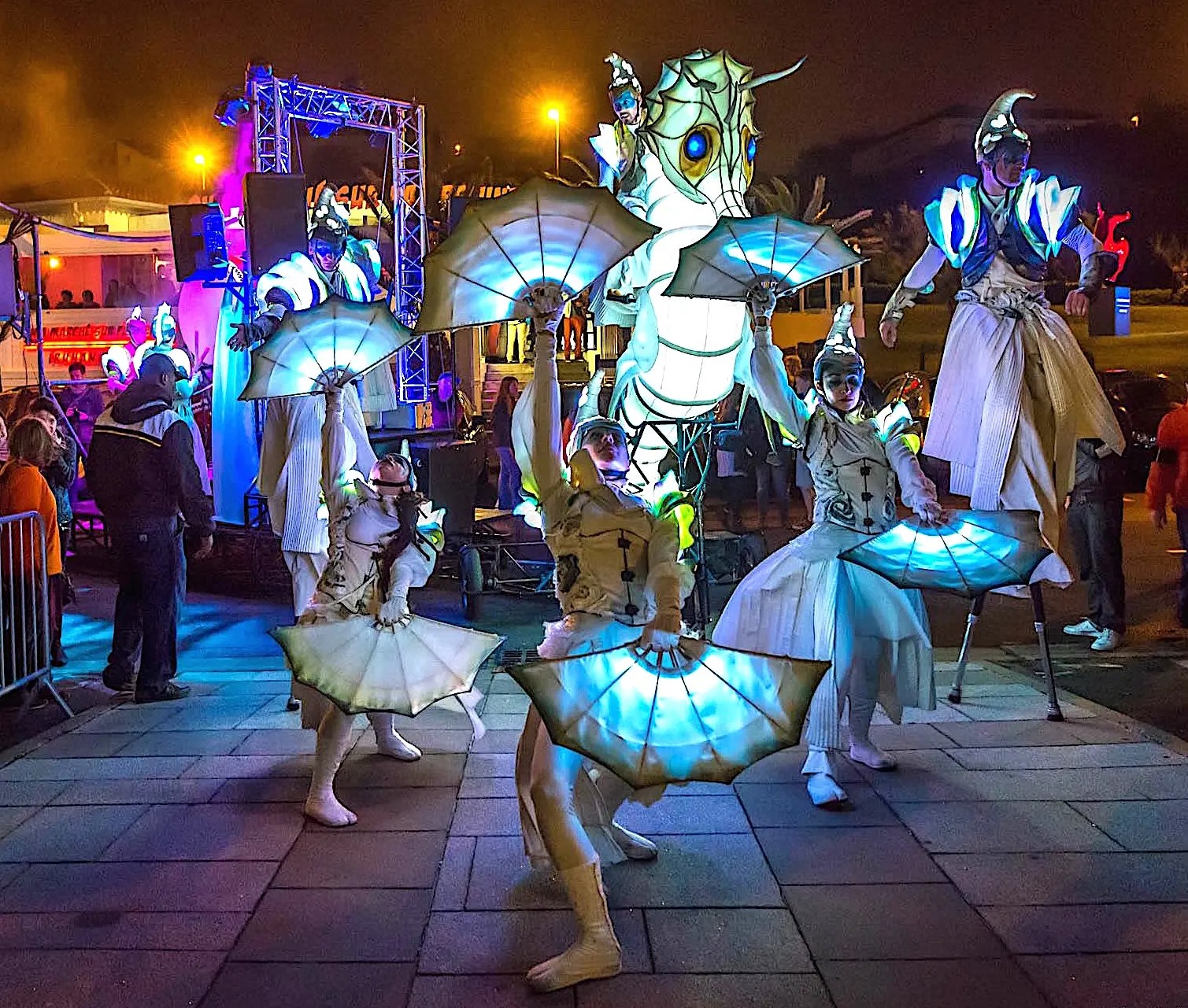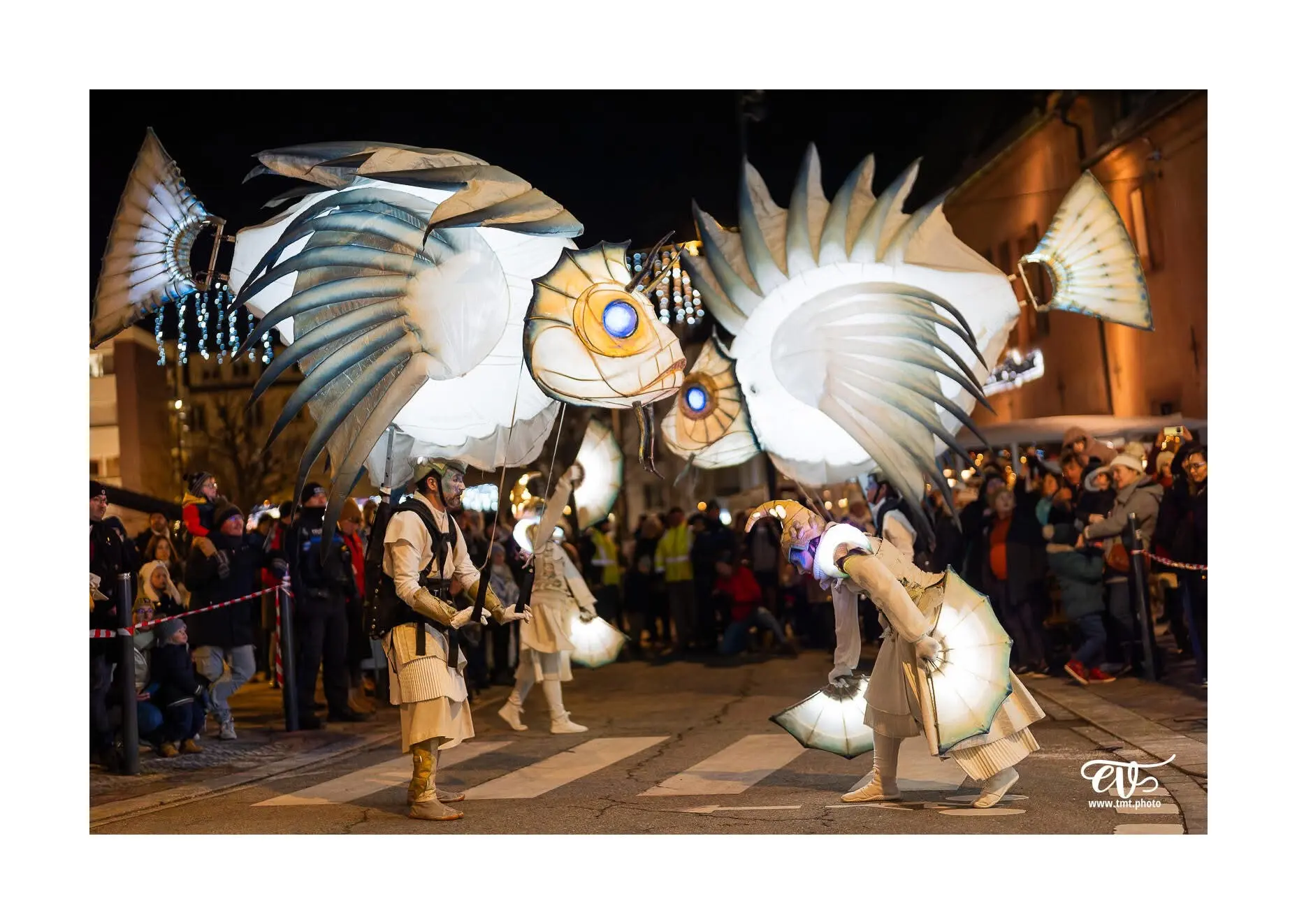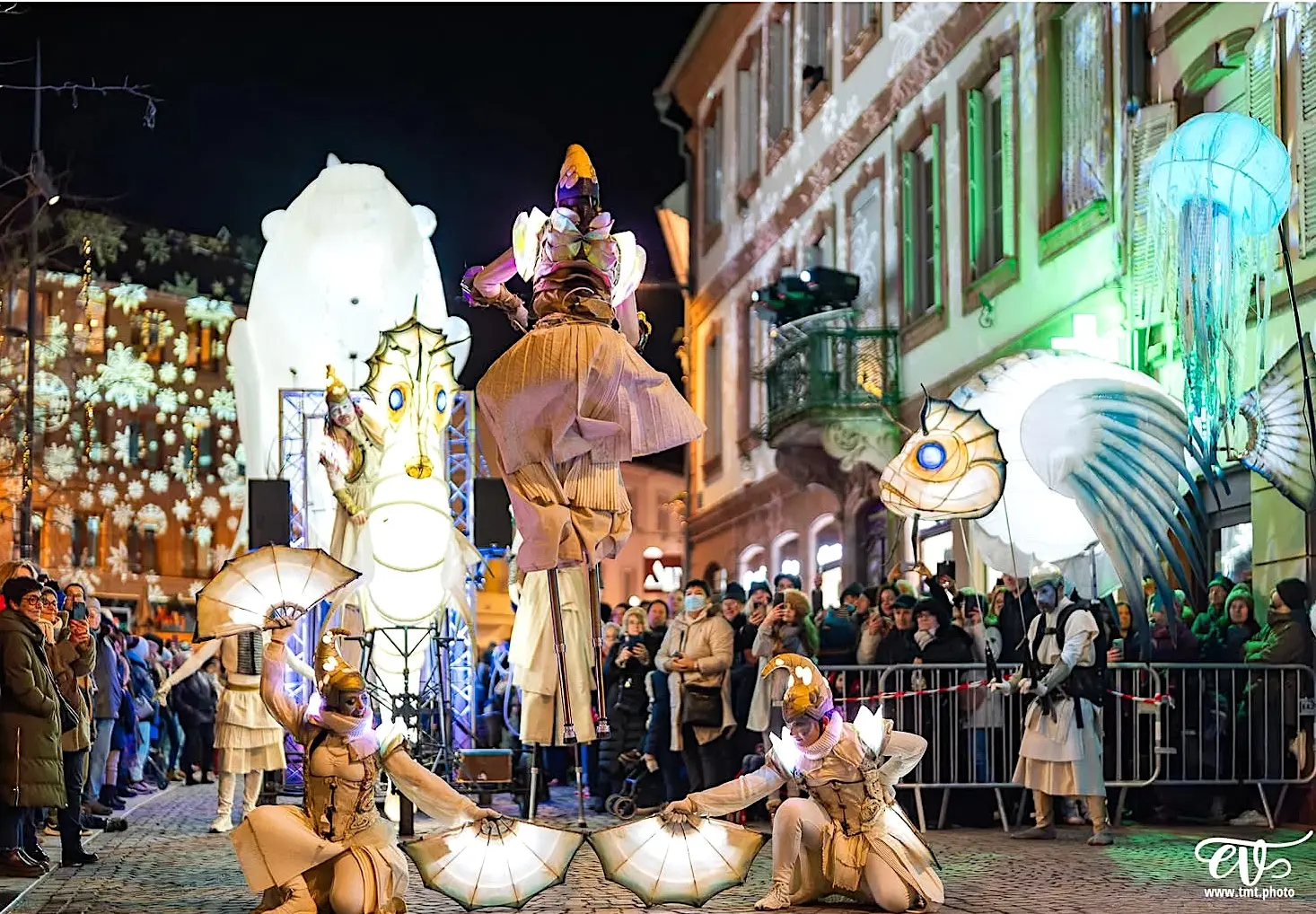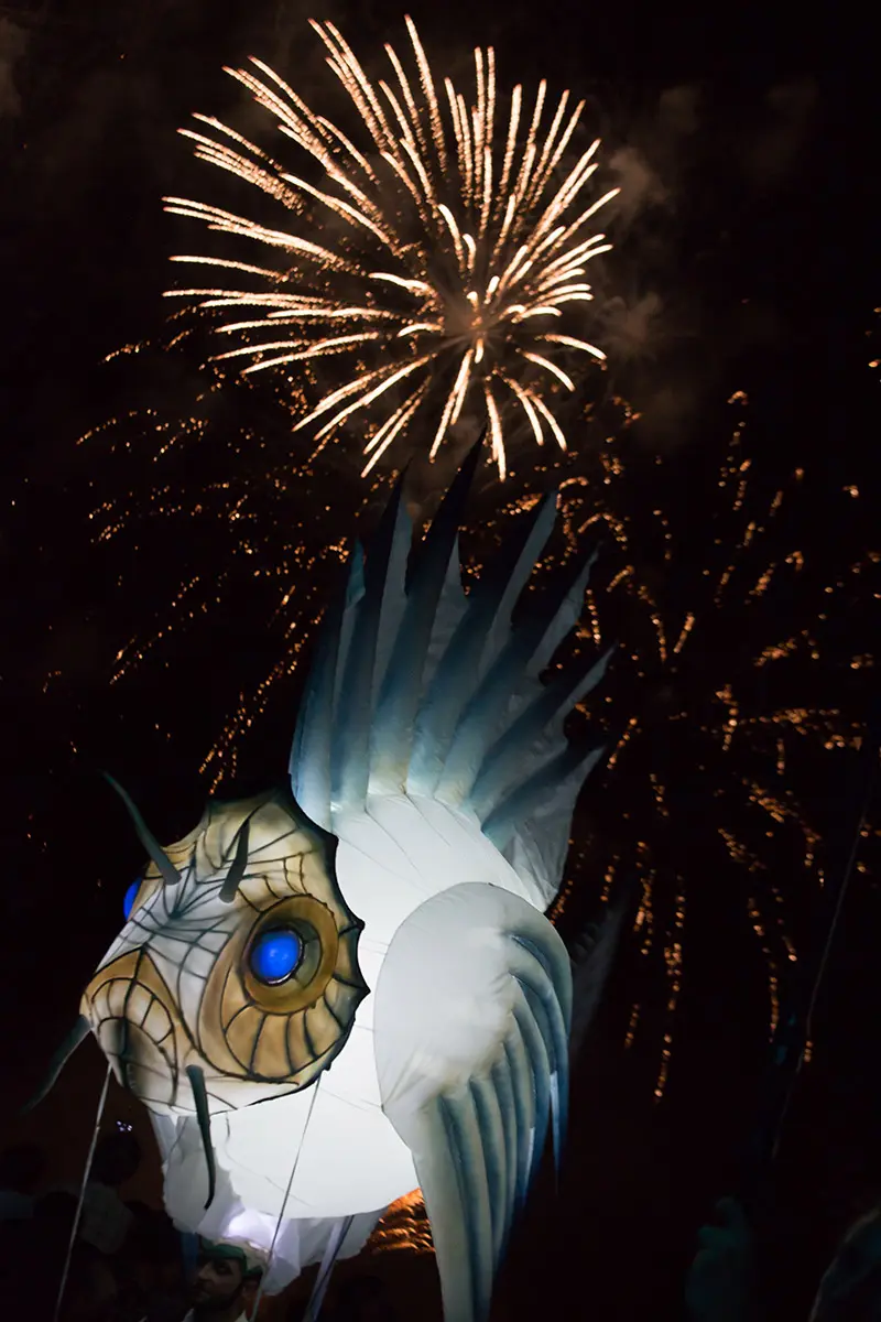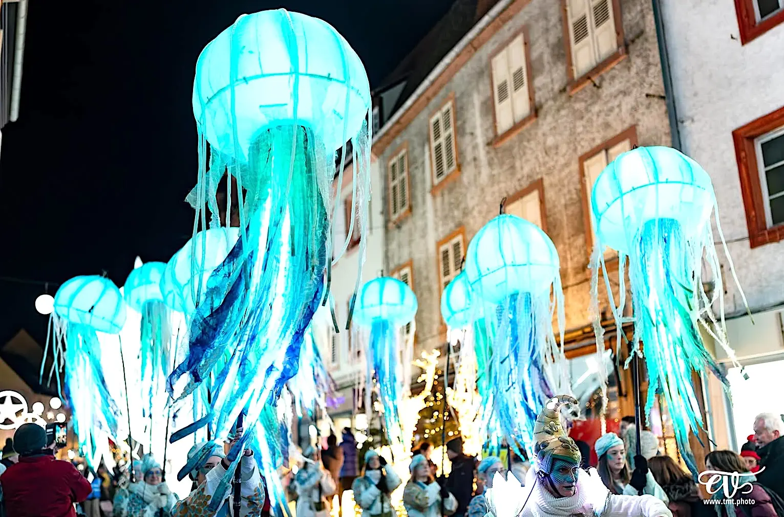 Eine beeindruckende Lichterprozession bewegt sich durch die Nacht, getragen von den Rhythmen der Taikos und Elektroklängen. Eine Milchstraße aus Quallen, funkelnde Gestirne, ein majestätisches Seepferdchen, begleitet von Stelzenläufern der Seeteufel, ziehen stolz den Wagen der Océanis an.