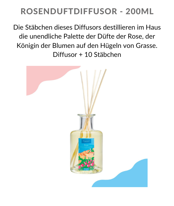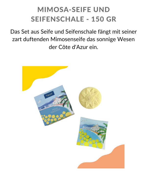 Um die charismatische Essenz der Côte d’Azur einzufangen, bietet die Produktreihe Côte d’Azur France auch eine Seife mit Mimosenduft, die an die Sanftheit der Blumen erinnert, sowie einen Raumduftspender mit dem betörenden Duft der Rose, der Herrscherin der Hügel von Grasse.